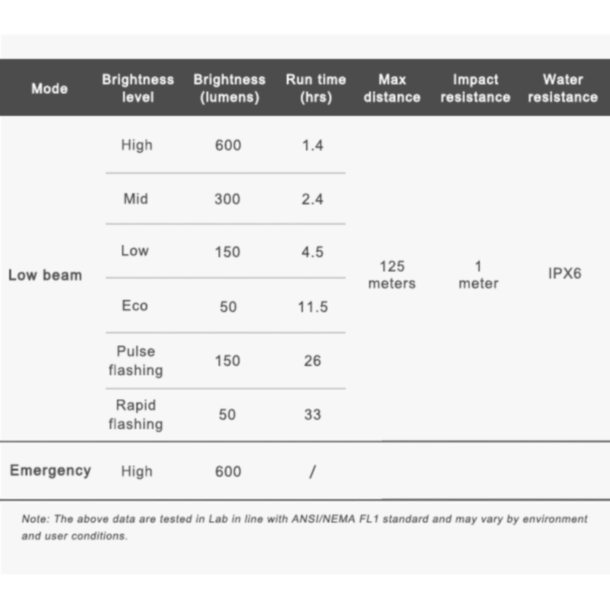 - 5 modes - Low, Medium, High, Pulse flashing, Quick flashing