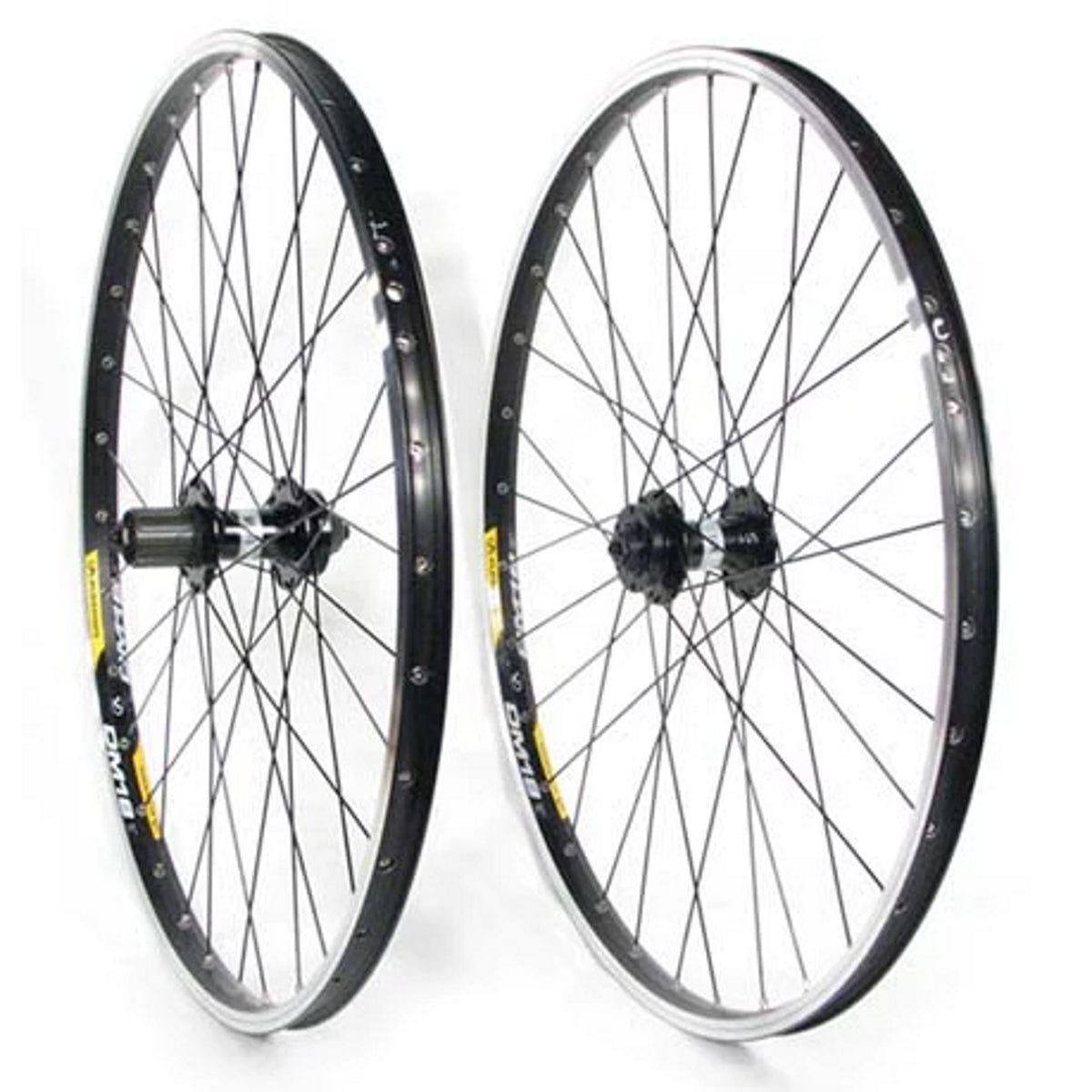 26" mountain bike wheels with black Alex DM18 dual wall rims with CNC sidewalls and stainless single eyelets laced to Joytech 6 bolt disc QR hubs.
